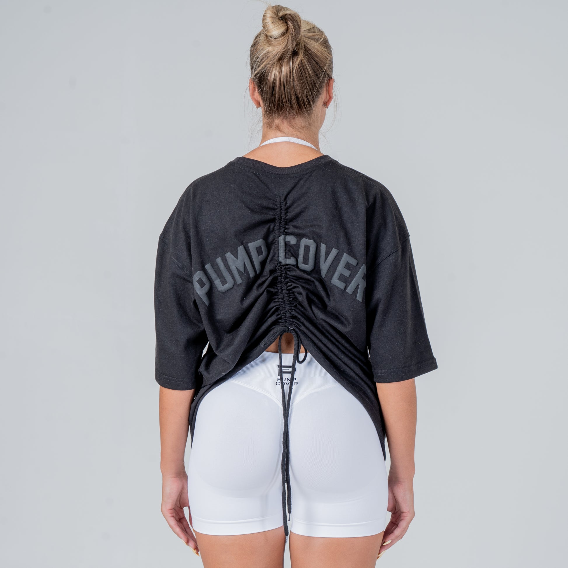 Say goodbye to tucking your tee into your sports bra mid-workout. Our Oversized Gym T-shirt features a patent-pending drawstring back—a sleek, secure way to cinch your shirt without compromising style or comfort. Whether you're lifting, stretching, or hitting cardio, this staple piece stays in place your way.